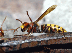 neugierige Freund, der vor dem Einflug zum Hornissennest auf fette