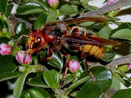 Anfang Mai, junge Hornissenkönigin Nektar trinkend an den Blüten einer Fächermispel (Cotoneaster horizontalis).