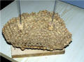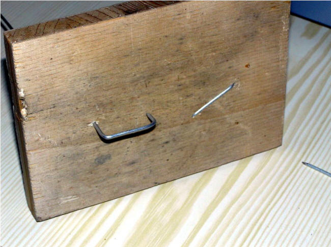 Ein stabiler Draht wird an einem Ende U-förmig gebogen und durch eine kleine Bohrung durch das Aufnahmebrett geführt. Das andere Ende wird in das Brett eingeschlagen.