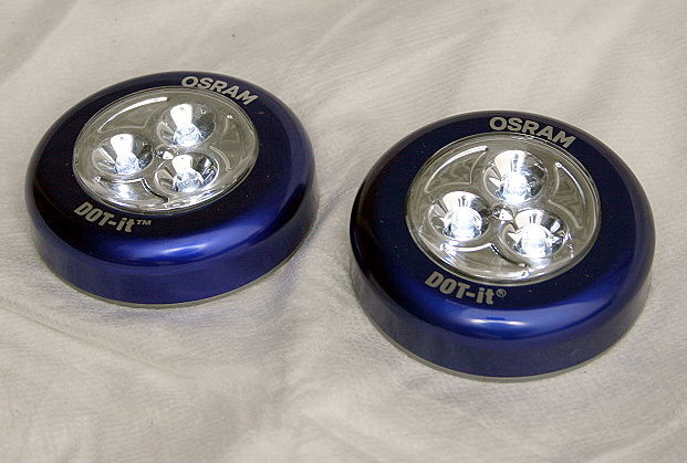 In diesem Fall haben sich besonders die kleinen, flachen, batteriebetriebenen LED-Möbelleuchten sehr gut bewährt (Einzeln oder als Dreierset im Baumarkt). Eingeschaltet stellt man diese auf den Boden im Rollladenkasten. Die Leuchtkraft reicht vollkommen aus, um von unten das komplette Wespennest auszuleuchten und am Nest zu arbeiten. Wespen die sich nun in Richtung Licht orientieren, können gut auf den kleinen Leuchten abgefangen werden.