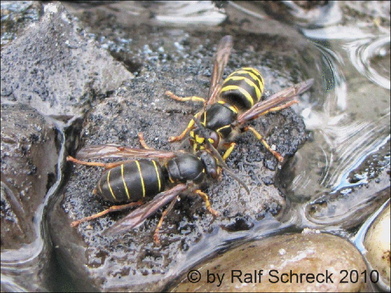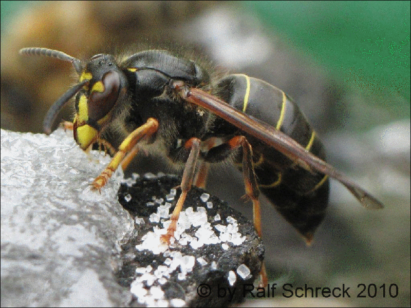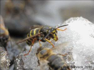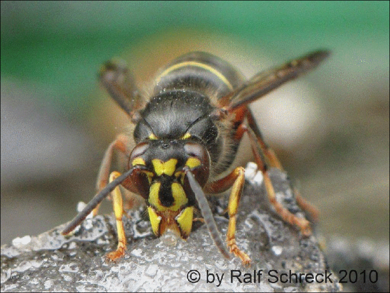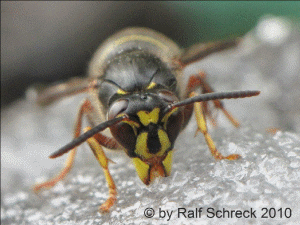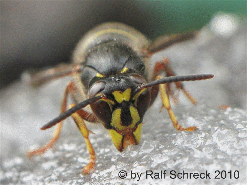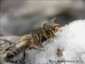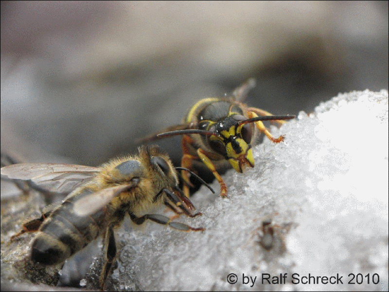 Porträtaufnahmen einer mittleren Wespe, gemeinsam mit einer Honigbiene