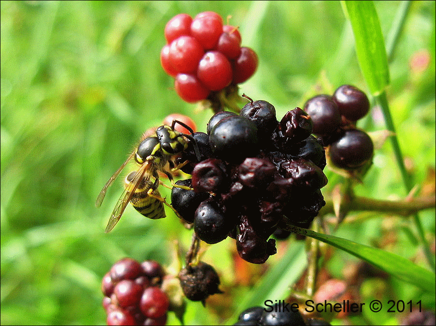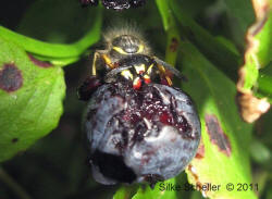 Arbeiterinnen der gemeinen Wespe - Porträtaufnahmen auf Waldbeeren
