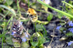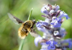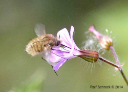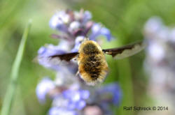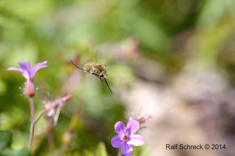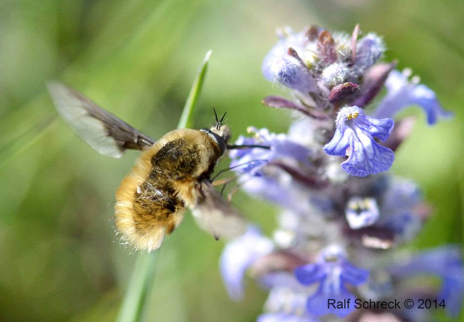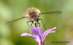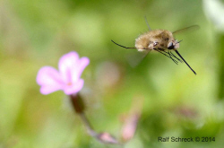 Wollschweber (Bombylius major) saugt genüsslich Nektar am