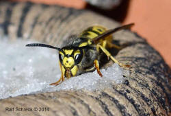 (Vespula germanica) tankt gerne an der Futterschale Energie, bevor