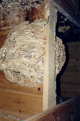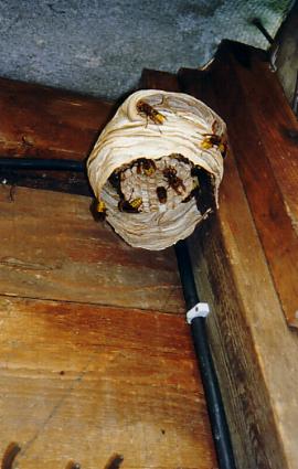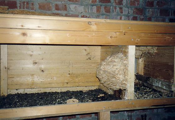 In einem Jagdansitz Hornissenvolk in einem Jagdansitz (Hochsitz). Dieses voll ausgebildete Hornissennest wurde zur Jagdzeit im September vom Jagdpächter entdeckt, als er den Ansitz nutzen wollte. Jedoch wurde er beim Besteigen der Leiter von den Verteidigungstieren an der Nutzung des Hochsitzes gehindert. Nach eingehender Beratung konnte das Nest bis zum Saisonende am Standort verbleiben.