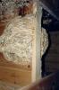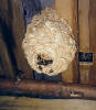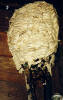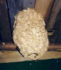 In einer Gartenhütte Anfang Juli entdeckte ein Gartenbesitzer das Hornissennest in seinem Geräteschuppen einer Schrebergartenkolonie. Während der Beratung vor Ort wurden seine Gartengeräte im Nestbereich entnommen. Begeistert von seinen "Untermietern", schickte mir der Gartenbesitzer die Aufnahme, des am Ende der Saison (Bild 2) ausgewachsenen Hornissennestes. Mit einem Schreiben bekundete er nochmals die Harmlosigkeit der Hornissen und das es zu keinerlei Konfrontationen beim Betreten der Hütte kam.