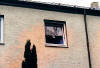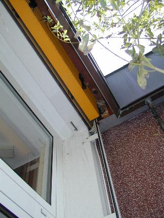 An einer Fensterecke Dieses Filialnest entstand im Lagerraum einer Computerfirma im 6. OG. eines Bürohauses. Da der Firmeninhaber nicht bereit war, bis zum Ende der Filialbildung zu warten, mussten die Tiere sowie das begonnene Nest entfernt werden. Hierzu wurde das gekippte Fenster und somit der Einflug verschlossen. Die Hornissenarbeiterinnen wurden abgefangen und der Wabenbau entfernt. Vor dem Gebäude wurden die Tiere wieder freigelassen. Trotz intensiver Suche, wurde der Neststandort des Hornissenvolkes nicht gefunden.