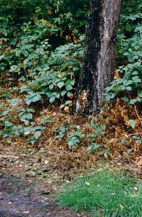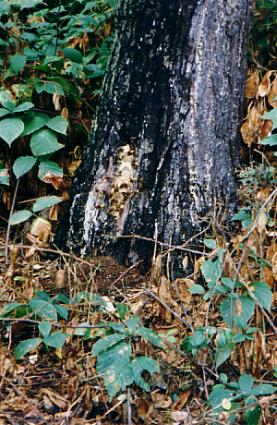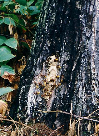 In einem hohlen Baum Als natürlichen Neststandort eines Hornissenvolkes dienen u.a. hohle Bäume an Waldlichtungen, Parklandschaften und Streuobstwiesen. Hier hatte sich ein Hornissenvolk an einem Waldweg eingenistet. Es war Ende September und Abflug der Geschlechtstiere. Zum Aufnahmezeitpunkt befanden sich Arbeiterinnen und abfliegende Geschlechtstiere auf der Außenhülle. Um das Hornissenvolk nicht unnötig zu Beunruhigen wurde der Weg für Passanten gesperrt.