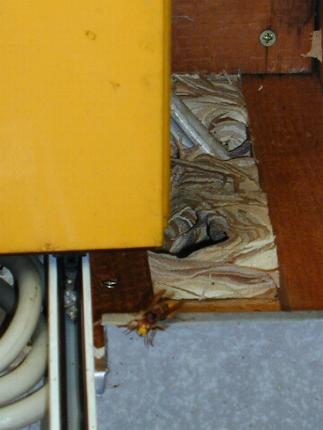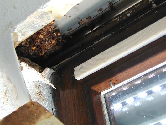 In einem Rollladenkasten In den meisten Fällen der Hornissenberatungen handelt es sich um Rollladennester. Sehr oft aber sind die Betroffenen bereit diese Nester zu dulden. Allerdings wird eine Umsiedlung in einigen wenigen Ausnahmen unumgänglich sein. Hier hatten sich z.B. die Hornissen durch den unteren Rollladendeckel durchgefressen.