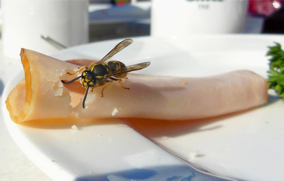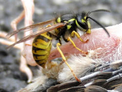 Besonders die Deutsche- und die Gemeine Wespe, also jene Arten, die dem Menschen lästig werden können, indem sie Kaffeetafeln oder Grillfleisch anfliegen, nehmen auch Aas an.