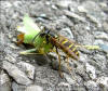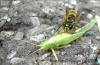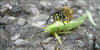 Deshalb wird die Beute Stück... Nicht verwertbare Körperteile werden dabei abgetrennt und liegen rund um die Beute verstreut. Immer wieder kehrt die Wespe zurück, um sich erneut, mit den Kieferzangen (Mandibel), ein Teil aus der Beute zu schneiden. Das aus der Beute herausgetrennte Stück wird zu einem "Fleichklops" zerkaut und dient wenig später den heranwachsenden Larven im Wespennest als Kraftnahrung. Letztendlich, nach mehreren Transportflügen, wird das letzte "Schreckenteil" für den Versorgungsflug vorbereitet.