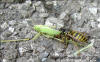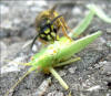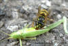 Gemeine Wespe (Vespula vulgaris) zerteilt eine Eichenschrecke (Mecronema thalassium)