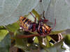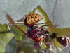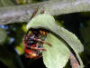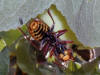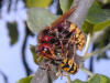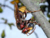 Zerteilen der Beute hängt sich die Hornisse mit einem Bein an einen Ast oder ein Blatt