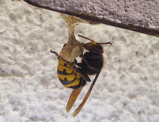 Etwa vier Stunden nachdem die ersten Wabenzellen gebaut waren, wurde von der Hornissenkönigin eine Zelle mit dem ersten Ei bestiftet.