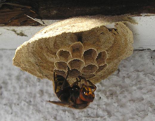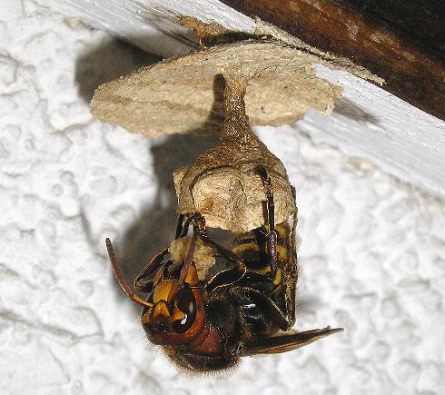 Immer wieder wird Baumaterial herangeschafft. Morsches, zu einem Pappmache´ zerkautem und mit Speichel vermischtem Holzbrei, dient der Nesterweiterung und gibt dem Hornissenbau das typisch bräunlich/ockerfarbene Aussehen.