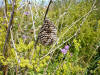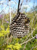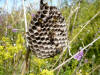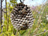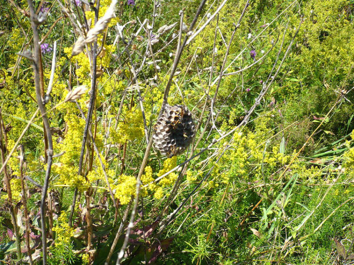 Nest einer Heide Fedwespe (Polistes nimpha) an einem Pflanzenstängel, auf einer stillgelegten Ackerfläche