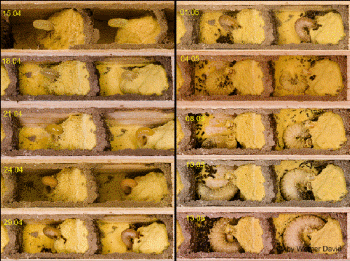 Entwicklung in der Brutröhre vom Ei über Laven- und Puppenstadium bis zum