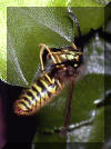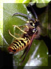 Wespe am Blatt einer Geranie hängend.