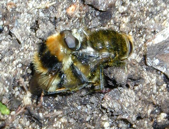 Das Männchen dieser Schwebfliegenart sah im Aussehen einer Ackerhummel, braunpelzig mit weißem Hinterleib, täuschend ähnlich.