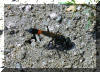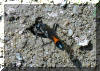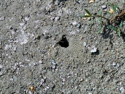 Bild 5 - 10: Immer wieder wird um den Einschlupf laufend, von der Grabwespe loser Sand mit den Vorderbeinen, auf den noch erkennbaren Einschlupf gekratzt. Zum Schluss ist vom Nesteingang nichts mehr zu erkennen.