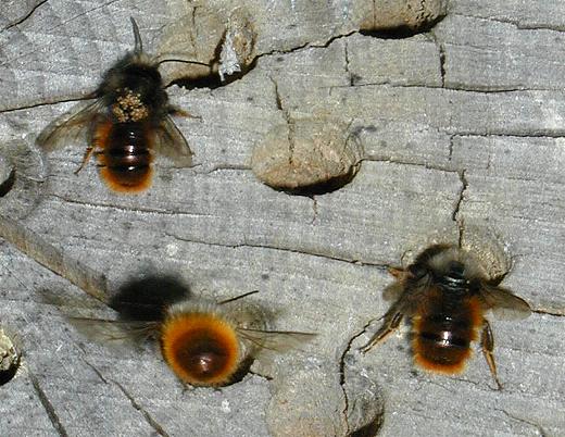 An der Wildbienennisthilfe in meinem Garten versammeln sich die bereits geschlüpften Drohnen der roten Mauerbiene Osmia rufa. Sie kämpfen um die besten Plätze an den gebohrten Löchern vom Nistholz. Schon bald werden hier die Weibchen schlüpfen, die sofort vom schnellsten Drohn begattet werden.