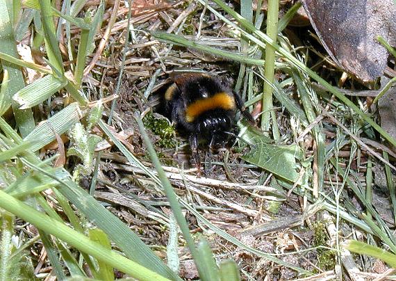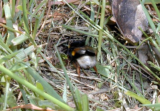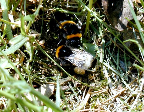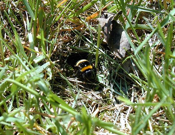 Reger Flugverkehr herrschte am etwa Daumendicken Loch im Boden der Kindergartenspielwiese. Hier flogen Erdhummelarbeiterinnen der ersten und zweiten Generation ein und aus. Während meiner Fotoaufnahmen überzeugte ich Frau H. von der Harmlosigkeit dieser Hummelart.