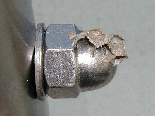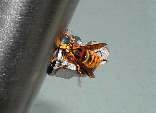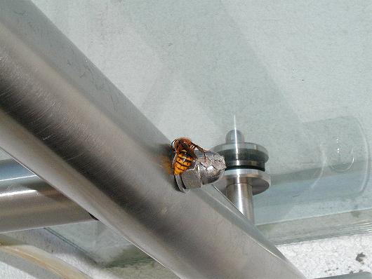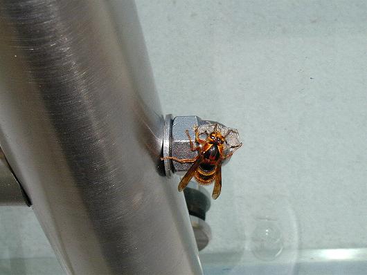 Etwas rutschig auf der glatten Edelstahlschraube begutachtete die Media-Königin ihre drei Wabenzellen, die ohne Wabenstiel direkt auf die blanke Metallschraube gebaut wurden.