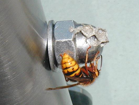 Tatsächlich, bei der Beratung vor Ort befand sich an der Verschraubung eines erst kürzlich montierten Glas-Terrassendaches die Anfangswabe einer Wespe.