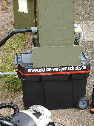 Hornissenumsiedlungskasten mit eingebauter Fangbox.