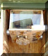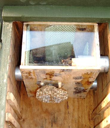 Unter der integrierten Fangbox die mit Heißkleber befestigte Wabe.