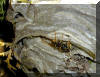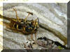 tätig. Die Nesthülle ist oben aufgebrochen und die inneren Waben