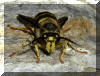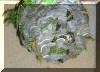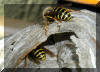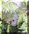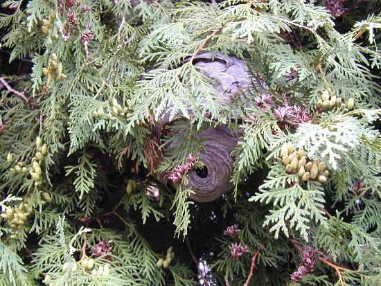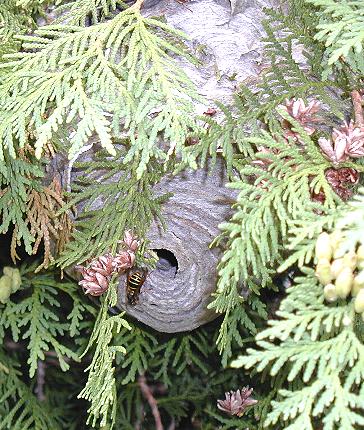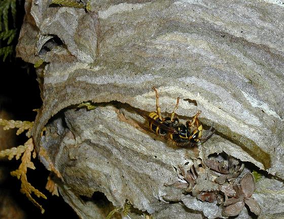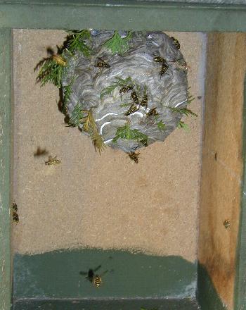eingeklebten Nest in die Hecke. Bald landeten die suchenden Wespen auf dem
