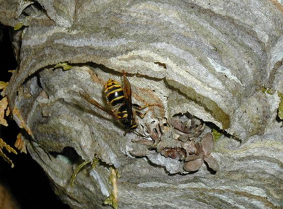 Wespen wieder im Nest verschwunden. Auf der Hülle harrten noch ein paar