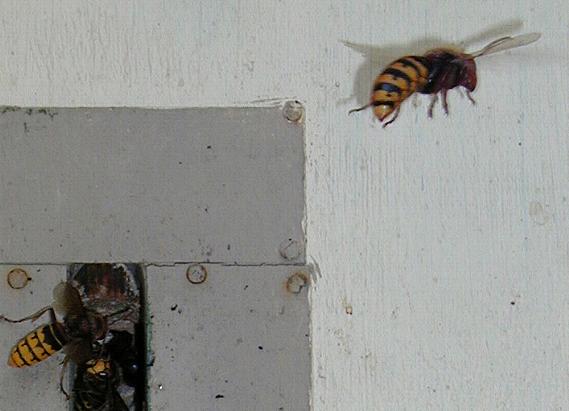 und Baumaterial beladen kehrten die Hornissen zu Einflug zurück, während