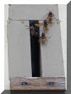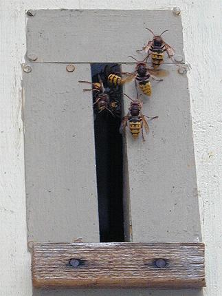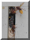 Hornissen aus dem Flugschlitz, um rund ums Nest nach dem Rechten zu sehen.