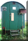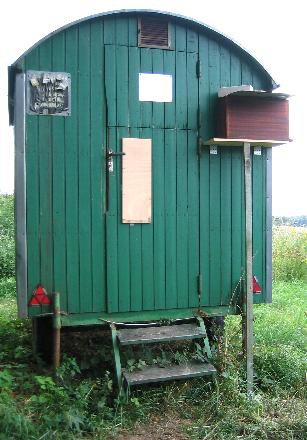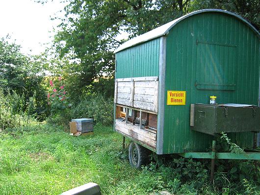 Der als Bienenstand umgebaute Bauwagen. Er befindet sich etwa 25 Kilometer von Limburg entfernt auf einer Freifläche. |
