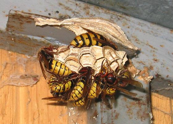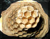 Typisch für die Filialbildung eines Hornissennestes: Innerhalb kürzester Zeit entsteht ein Hornissennest. Viele Arbeiterinnen kümmern sich um den Nestbau. In den Waben befindet sich weder Brut noch Larven in den verschiedenen Stadien. Übrigens, die Königin befindet sich hier bereits im Nest. Am oberen Wabenstiel kann man den Hinterleib von ihr erkennen. |