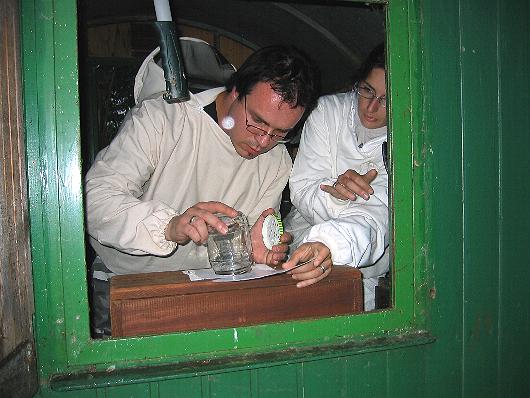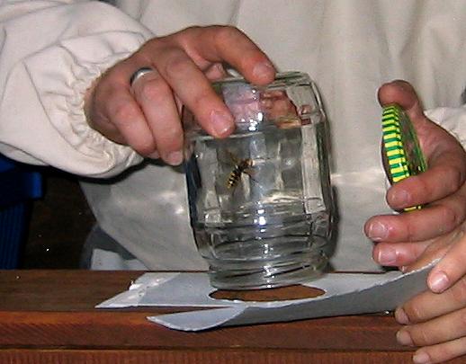 Hans-Jürgen, ein begeisterter Wespen- und Hornissenliebhaber, beim Abfangen der der Arbeiterinnen von der Filialwabe. Mit einem in Honig getauchtem Stäbchen fängt er jedes einzelne Tier von der Wabe ab und setzt es behutsam in ein ausgedientes Marmeladenglas. |