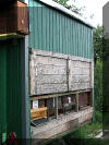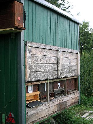 Der neue Standort der Umquartierten Hornissenfiliale: In einem Ablegerkasten direkt neben dem Eingang zum Imkerstand. Somit mussten sich die Hornissen nicht großartig umorientieren. Nach kurzen Such- und Orientierungsflügen wurde der Nistkasten von den Hornissenarbeiterinnen angenommen. |