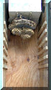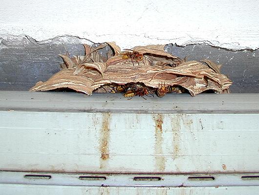 Direkt auf den Rollladen aufgesetzt zeigt sich das Hornissennest nach öffnen des Rollladenkastens. Im weiteren Verlauf der Saison wäre hier jedes Mal beim Betätigen des Rollladens das Nest verletzt worden. |