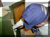 Wie ein Profi klebt Hans-Jürgen die entnommene Wabe aus dem Rollladen in den bereit gestellten Hornissennistkasten.