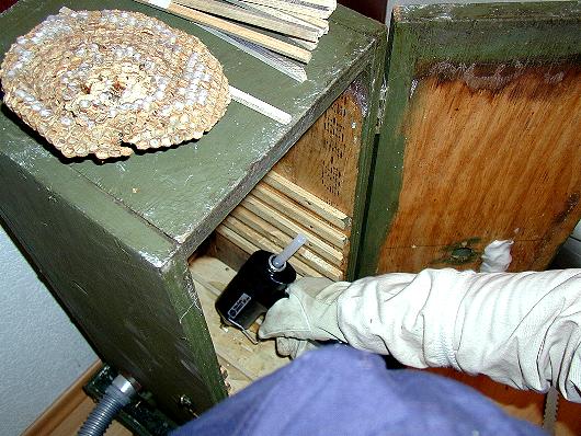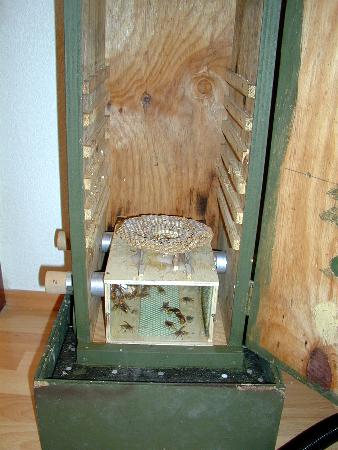 Vorher konnte Hans-Jürgen die Hornissen mit dem Sauger aus dem Rollladenkasten abfangen. "Das ist schon etwas anderes als das Abfangen der Hornissen mit einem in Honig getauchtes Holzstäbchen". (siehe Bildergalerie 31.07.05)