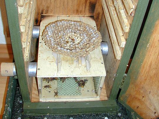 Immer wieder werden einfliegende Hornissen abgefangen, die umgehend in der fest eingebauten Fangbox des Hornissen-Umsiedlungskastens landen. Zum Schluss befinden sich etwa 40-50 Hornissenarbeiterinnen und die Königin in der Box.