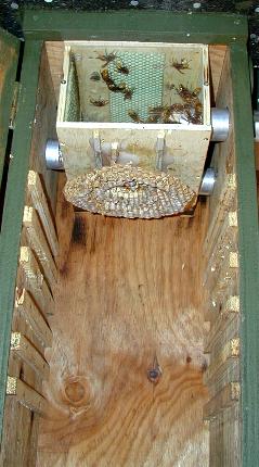 Saisonende - Nest ohne Hülle - Noch 1 1/2 Wabenetagen wurden angebaut. Das Nest war durch den Verlust der Königin - Drohnenbrütig |