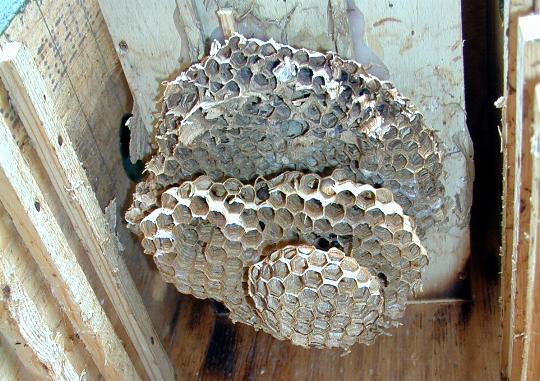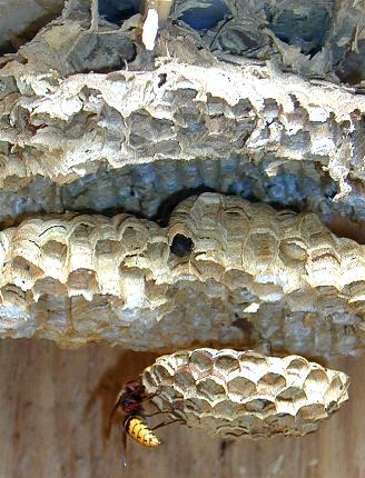 Während der Fotoaufnahmen vom verlassenen Nest, landete eine Hornissenarbeiterin aus meinem, noch belebten Hornissennest im Garten, direkt auf alten den Waben. Ganz aufgeregt begutachtete sie den verlassenen Bau. Mit der selben Aufregung flog sie nach etwa 3 Minuten zum nahe gelegenen Heimatnest zurück. Kurz darauf war sie schon wieder da und erkundete nochmals die verlassenen Waben.