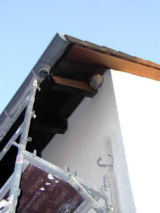 südwestlicher Lage am Dachvorsprung. Das Malergerüst war bereits