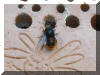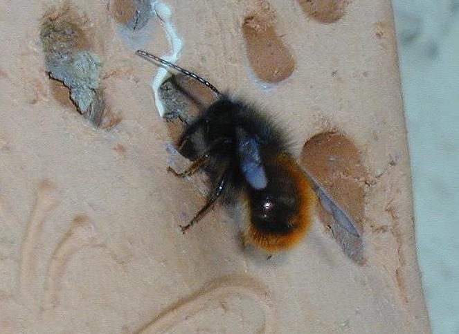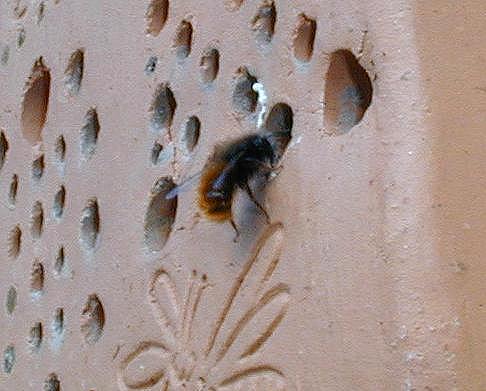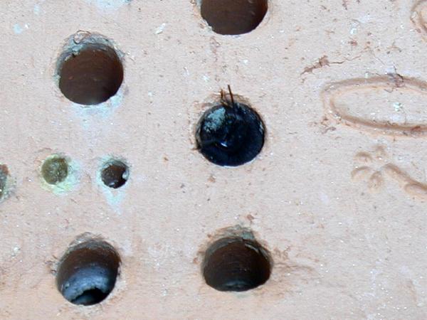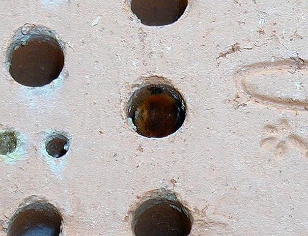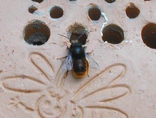 Zum Schluss, nachdem etwa fünf Brutkammern angelegt und durch Lehm versiegelt wurden, kommt noch ein Verschluss aus Lehm auf den Einflug. Die erste Kammer dahinter ist leer um einem Bruträuber nicht gleich Beute anzubieten. In etwa vier Wochen ist von den Mauerbienen nichts mehr zu sehen. Die Weibchen sind verendet. In den angelegten Brutröhren allerdings wächst schon die nächste Generation Mauerbienen für den kommenden Frühling 2007 heran. |
