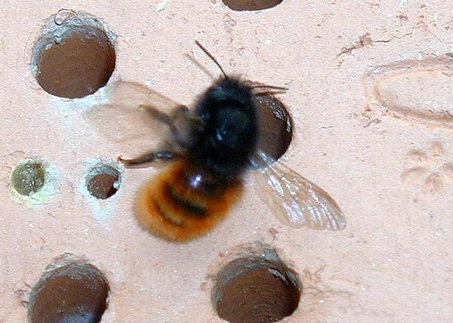 Erste Flugbewegungen an der Wildbienennisthilfe
