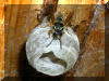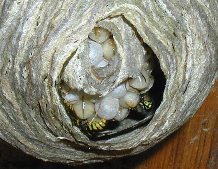 Wespennestes, das mittlerweile auf zwei, mit Larven und Eiern gut
