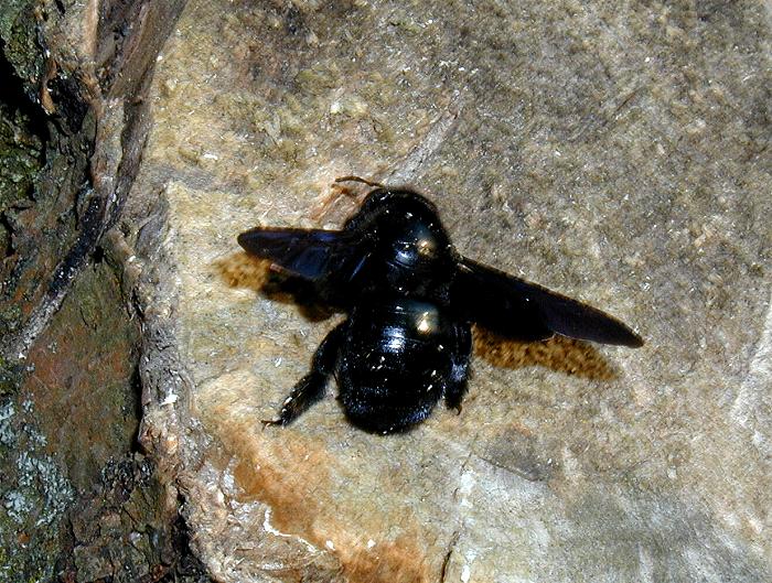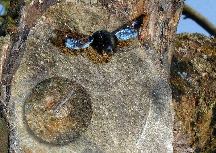 Holzbiene angeflogen, die punktgenau die Stelle am morschen Ast anflog,